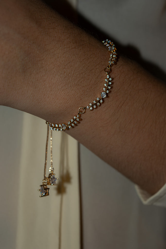 A dainty, scalloped gold-filled bracelet of floral connectors adorned with cubic zirconia. Comes with a box, a felt keepsake pouch, and a written thank you note.