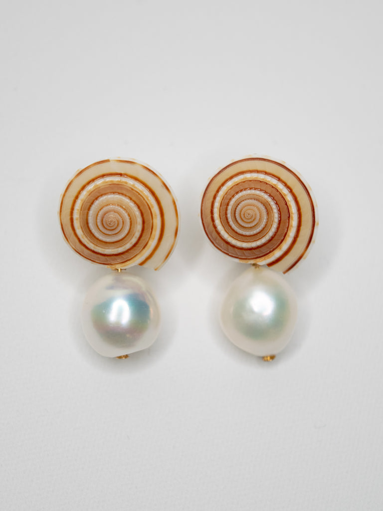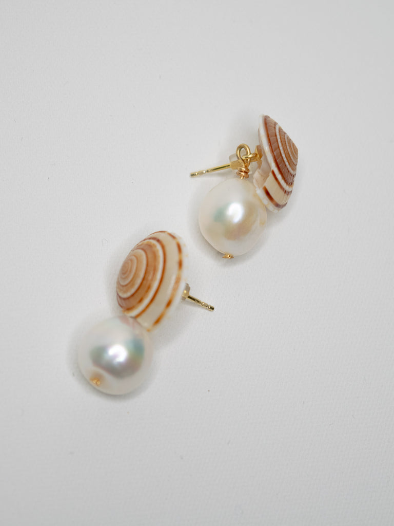 Drop earrings made from Architectonica perspectiva snail shells, paired with high-luster freshwater pearls. 18k gold stud backings.