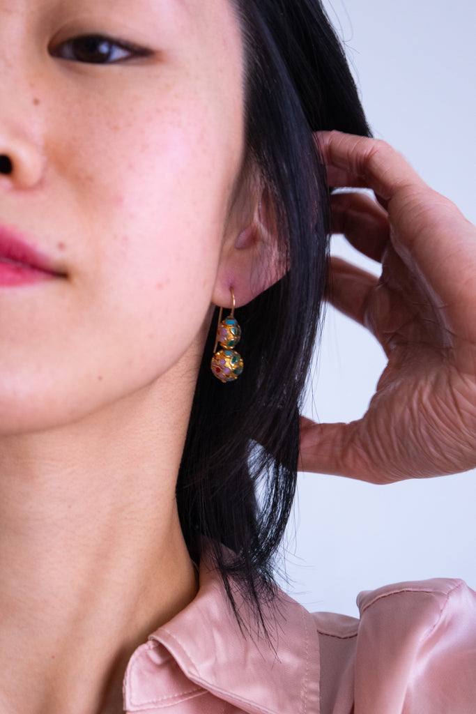 Handmade stacked cloisonné drop earrings. Secured by rubber and gold-fill backings.