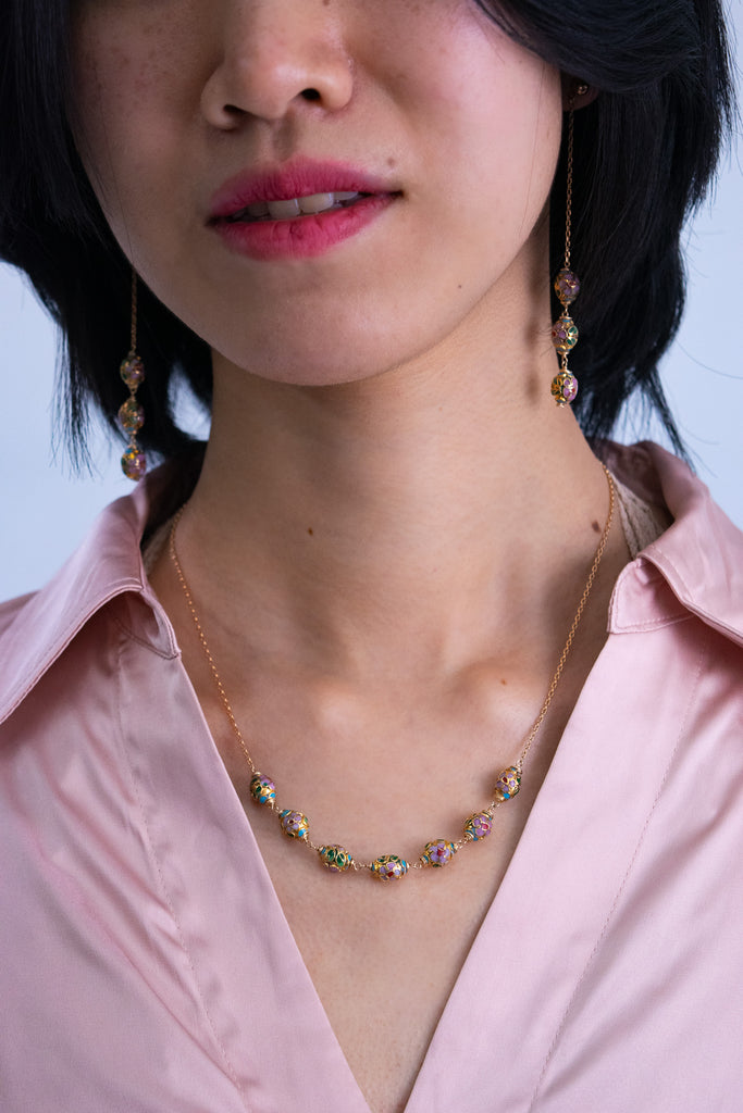 A dainty 14k gold-filled chain of 7 cloisonné beads wired into modern and unique silhouette. The necklace is secured by a lobster clasp, and features a chain extender