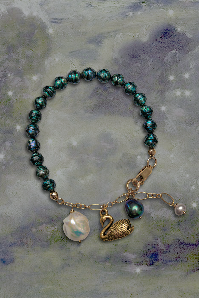 A charm bracelet for your Black Swan side. Made with rare, faceted peacock pearls.